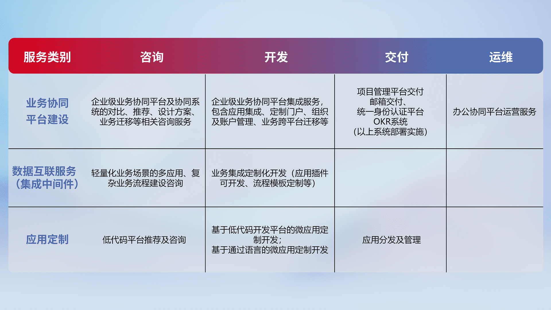 针对钉钉、、企微、、、IDaas等平台级产品提供产品的规划、、、、方案、、、、交付、、、、定制化开发等服务,,,实现如统一协同办公、、、智能客户服务、、混合会议管理、、、智能数据查询、、等业务场景,,,,实现数字化转型。。。