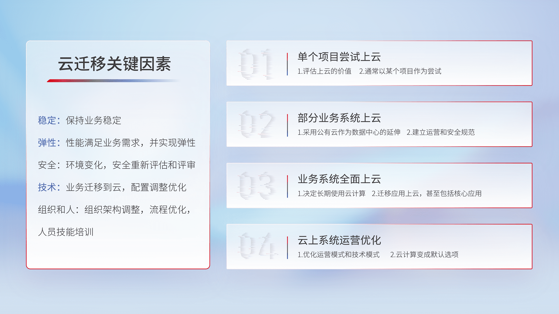 结合实际业务,,,,从规划设计、、云平台选型、、、云原生改造、、数据迁移、、、、集成交付,,迁移全过程为客户识别最佳上云路径,,,,做好风险识别管理,,,设计网络架构、、、身份权限、、安全审计合规、、、、操作审计、、日志审计、、、监控告警策略、、多站点容灾设计等,,,对云上基础设施进行整体规划,,提升IT治理水平,,,以满足弹性、、、高可用、、、、高性能的需求。。。