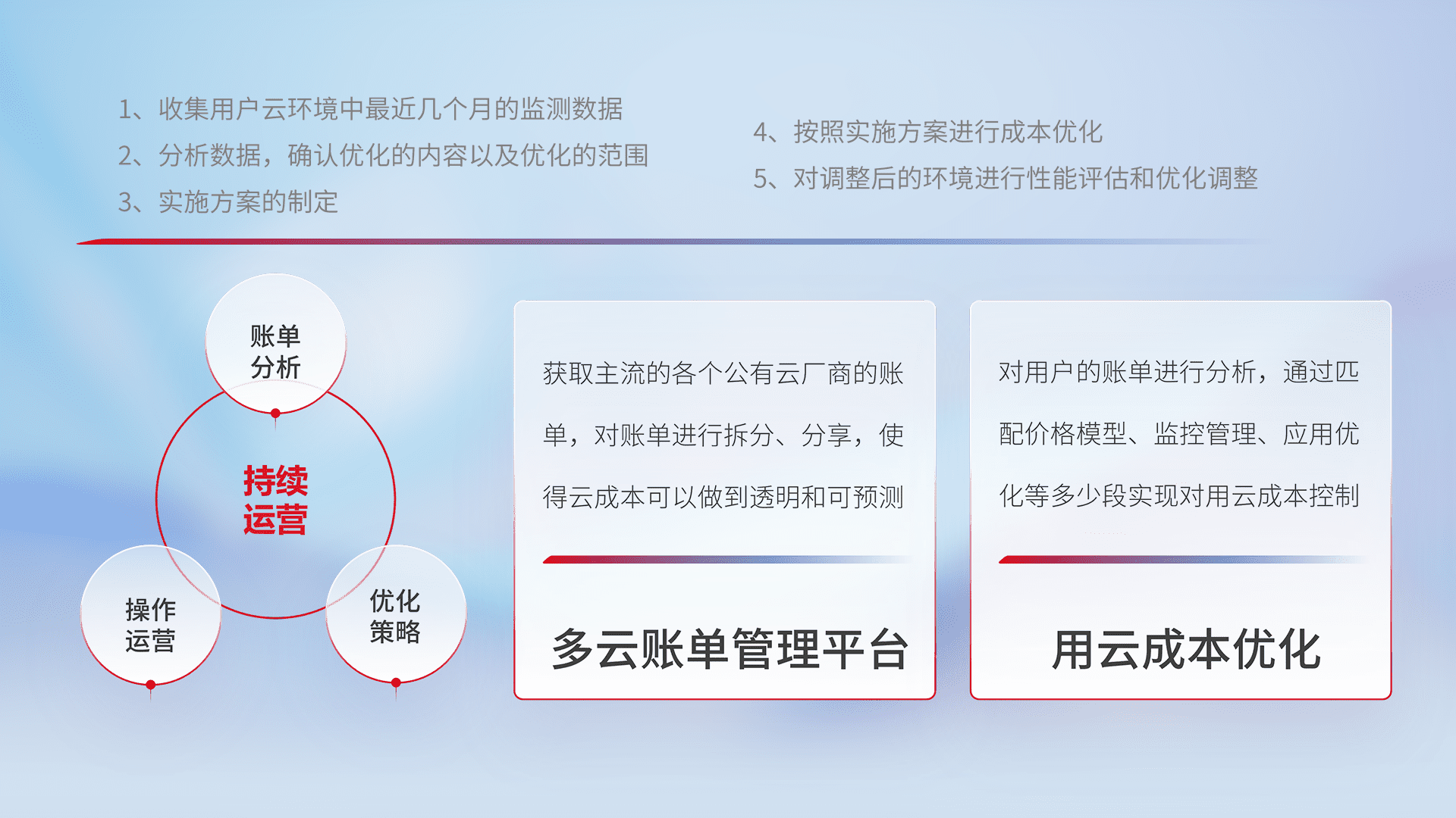 通过多云纳管,,,以统一的资源数据模型把客户的云资源进行抽象和封装,,进而实现对多云资源的统一操作,,,保障云资源管理的可靠性、、、稳定性与可用性。。。量身定制化运维内容,,,配置、、开发运维、、、补丁管理、、、、备份、、、、监控、、、认证和访问管理、、审计和日常巡检等,,保障在用云过程中的可靠度,,稳定度以及高可用率。。